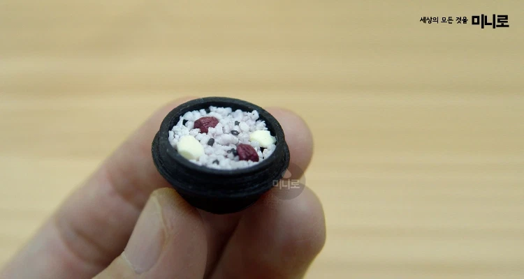 الوصف: نموذج مصغر مفصل لأرز كوري مغذي بخمسة حبوب (ogokbap)، يتميز بقوام متعدد الحبوب واقعي وألوان طبيعية.