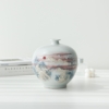 Each piece features hand-painted scenes depicting a serene Korean countryside in winter – thatched-roof cottages nestled among snow-covered hills with graceful pine trees. The brushwork captures the tranquil essence of traditional Korean landscape painting, making each set a unique work of functional art.