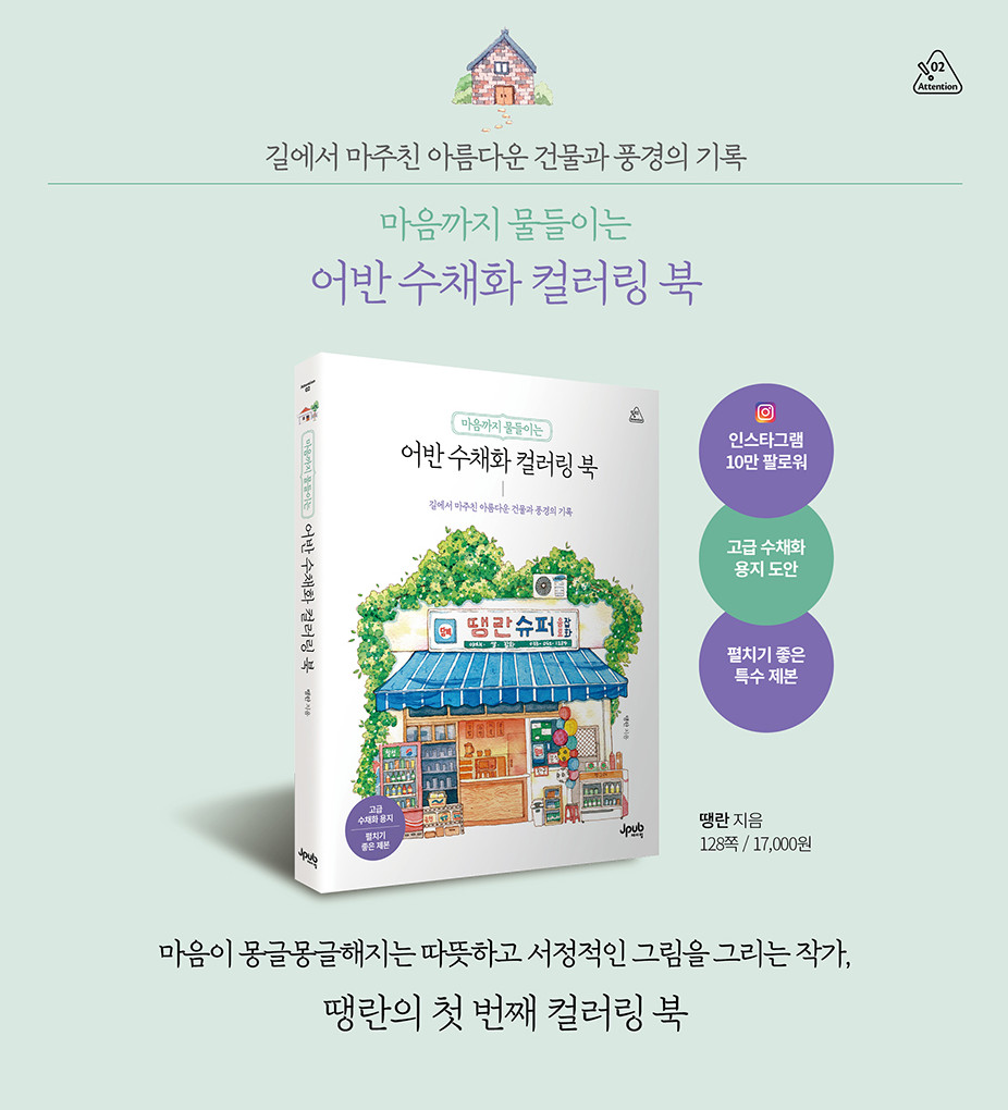 This watercolor coloring book captures the charm of ordinary yet heartwarming urban scenes. Known for her delicate and emotional style, Ttaengran presents her first coloring collection featuring some of her most beloved works from Instagram as well as previously unreleased illustrations.