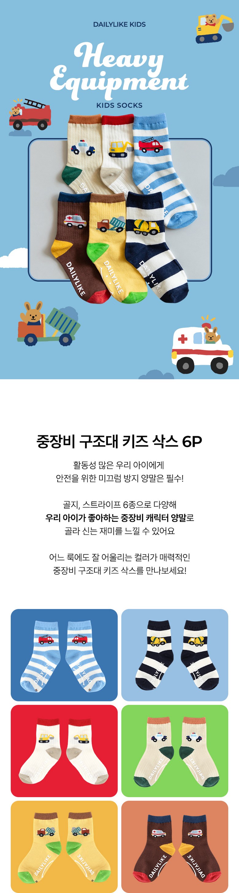 Dailylike Kids Socks 6 Pairs Set – Construction Vehicle Rescue Team