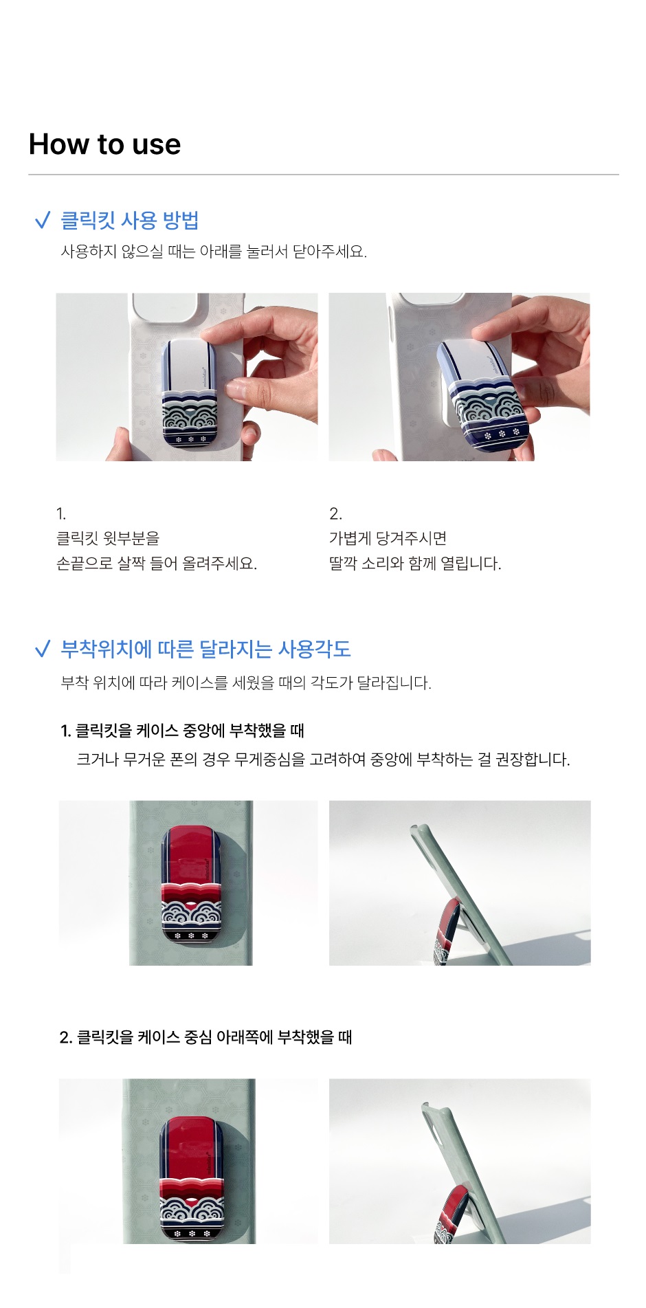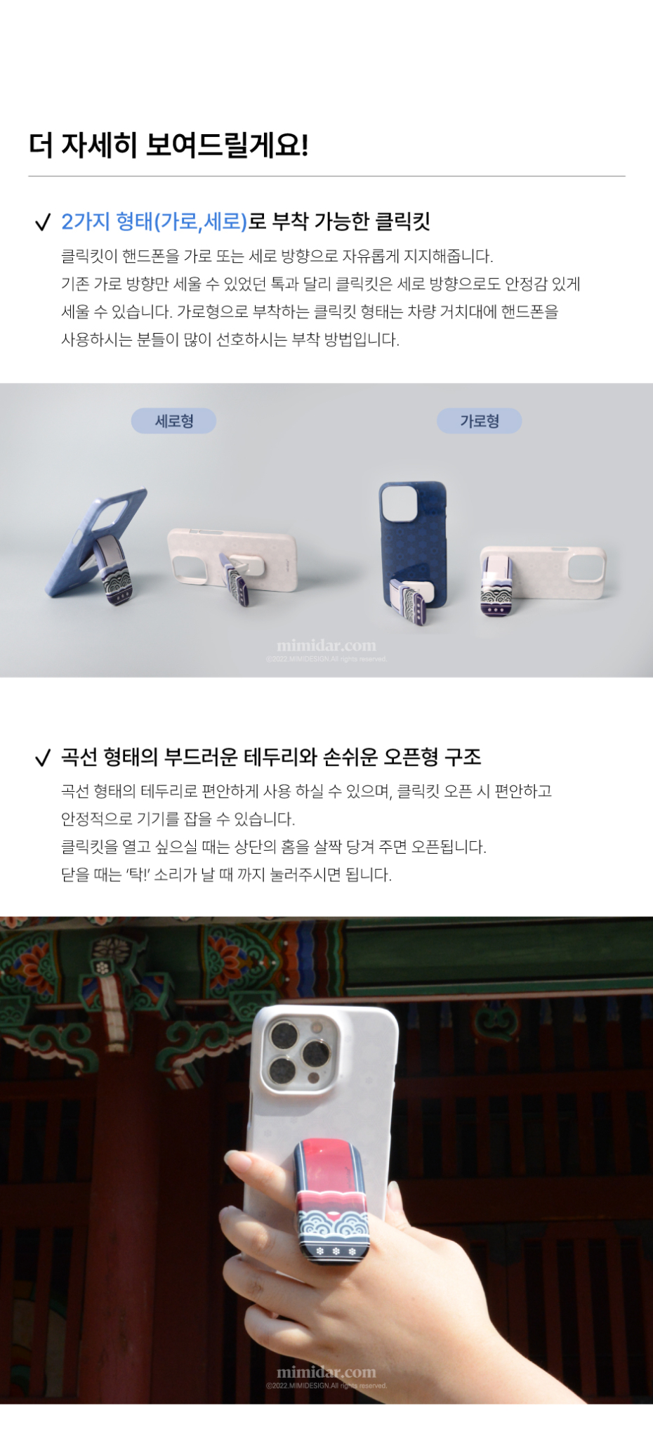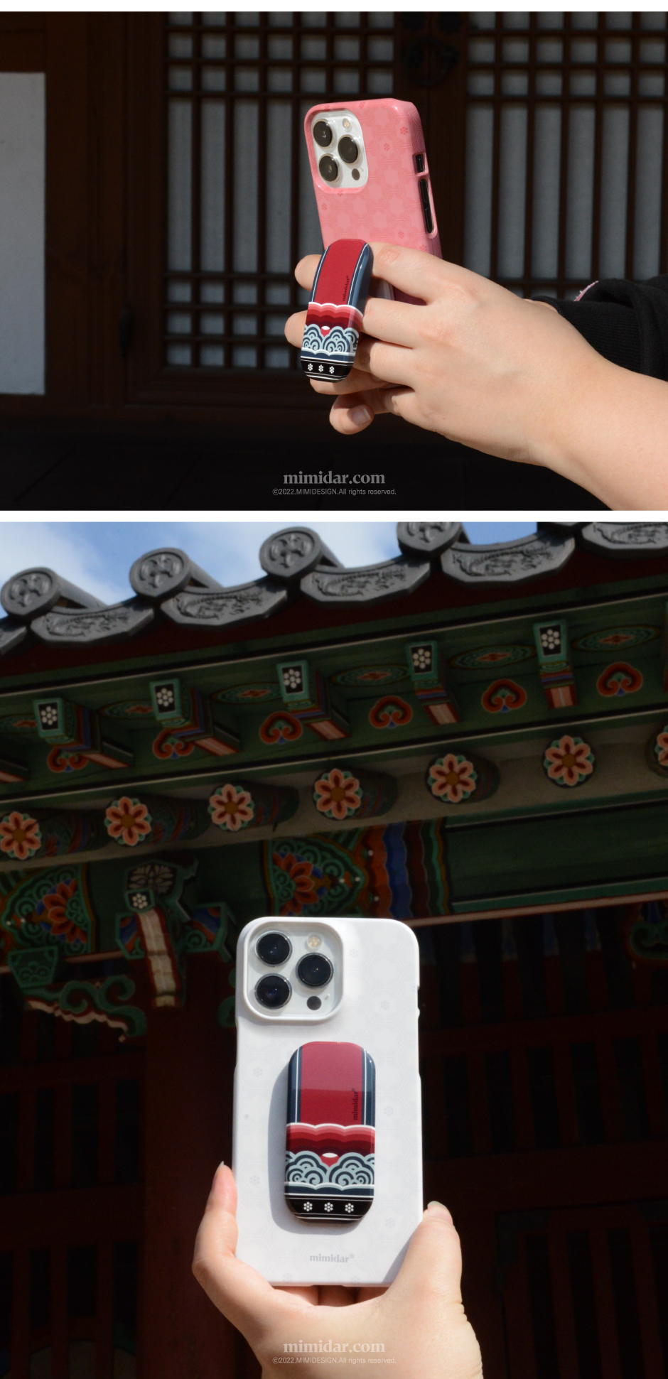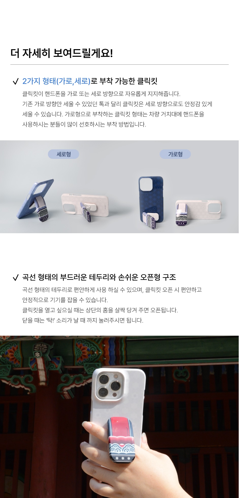 Bring the beauty of traditional Korean dancheong (decorative painting used in palace and temple architecture) into your daily life with the Dancheong Clickkit. Inspired by the colors and patterns beneath eaves, this phone grip and stand beautifully connects tradition and modern utility.