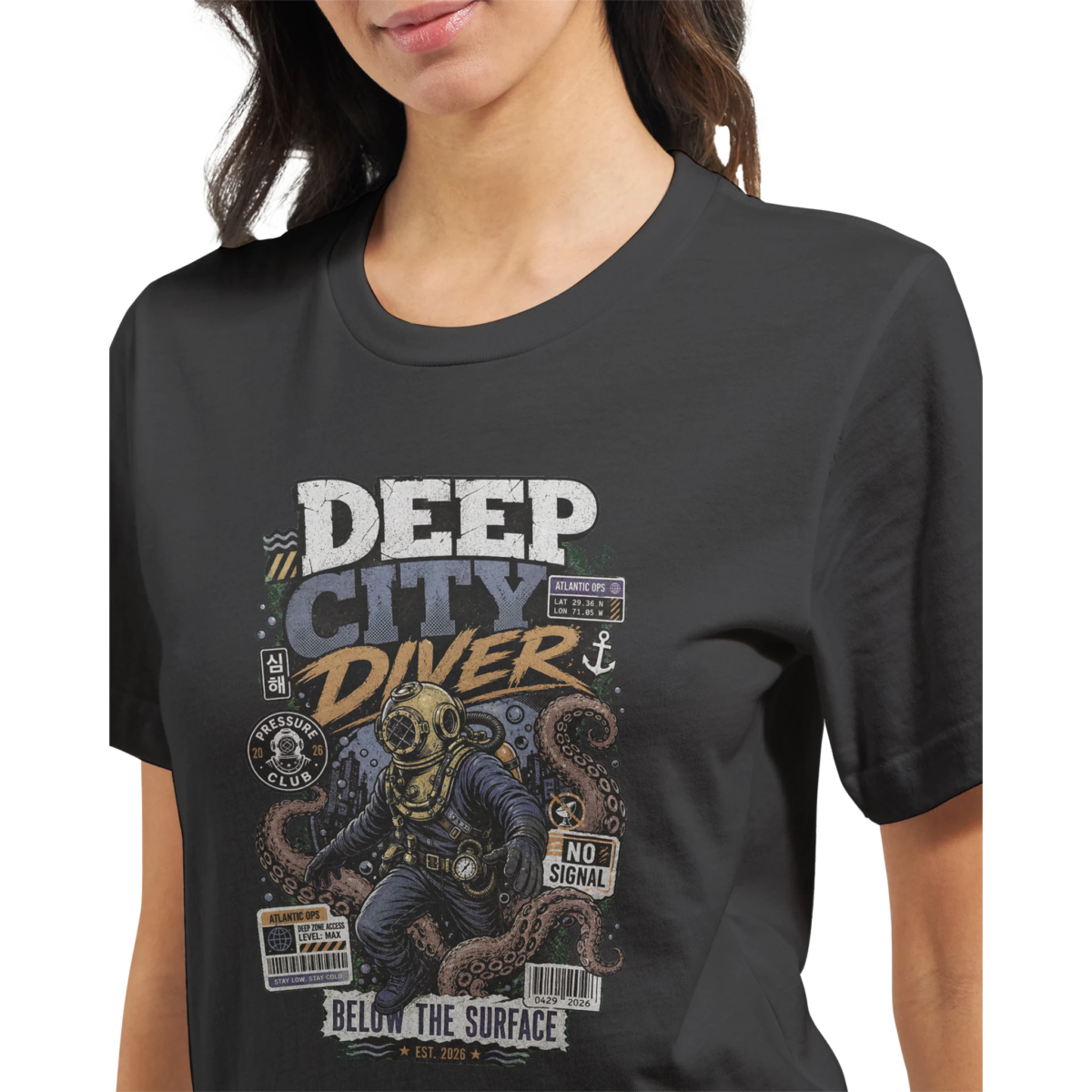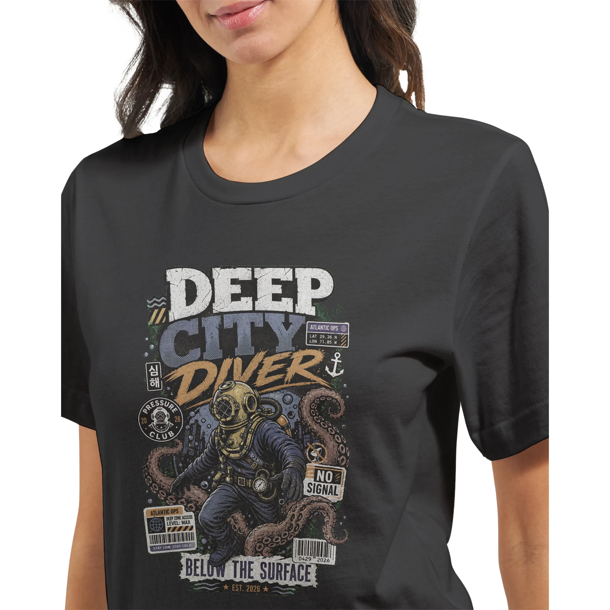 The central illustration features a vintage deep-sea diver, rendered in a striking array of white, dark grey, and gold, with accents of dark blue, teal, orange, brown, and light blue. This intrepid explorer is surrounded by the swirling tentacles of an octopus, along with an anchor, pressure gauge, and delicate bubbles, all set against a backdrop suggesting deep-sea currents and waves. Technical and cryptic elements are integrated, including various barcodes, a warning sign, and a prominent “NO SIGNAL” message. Textual details like “DEEP CITY DIVER,” “ATLANTIC OPS,” and coordinates “LAT 29 36 N, LONG 77 02 W” enhance the exploratory theme. Further intrigue is added by “PRESSURE CLUB,” Korean script translating to “Deep Sea,” “MAXIMUM DECOMPRESSION NEEDED,” “LEVEL MAX,” “BARO.COM/DEEPDIVE,” and “BELOW THE SURFACE, EST. 2026,” all meticulously placed across the front center chest to create a rich, adventurous tableau.