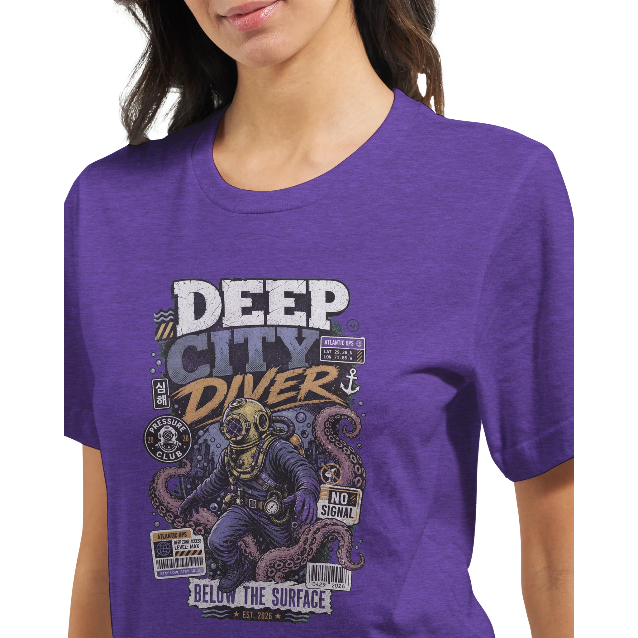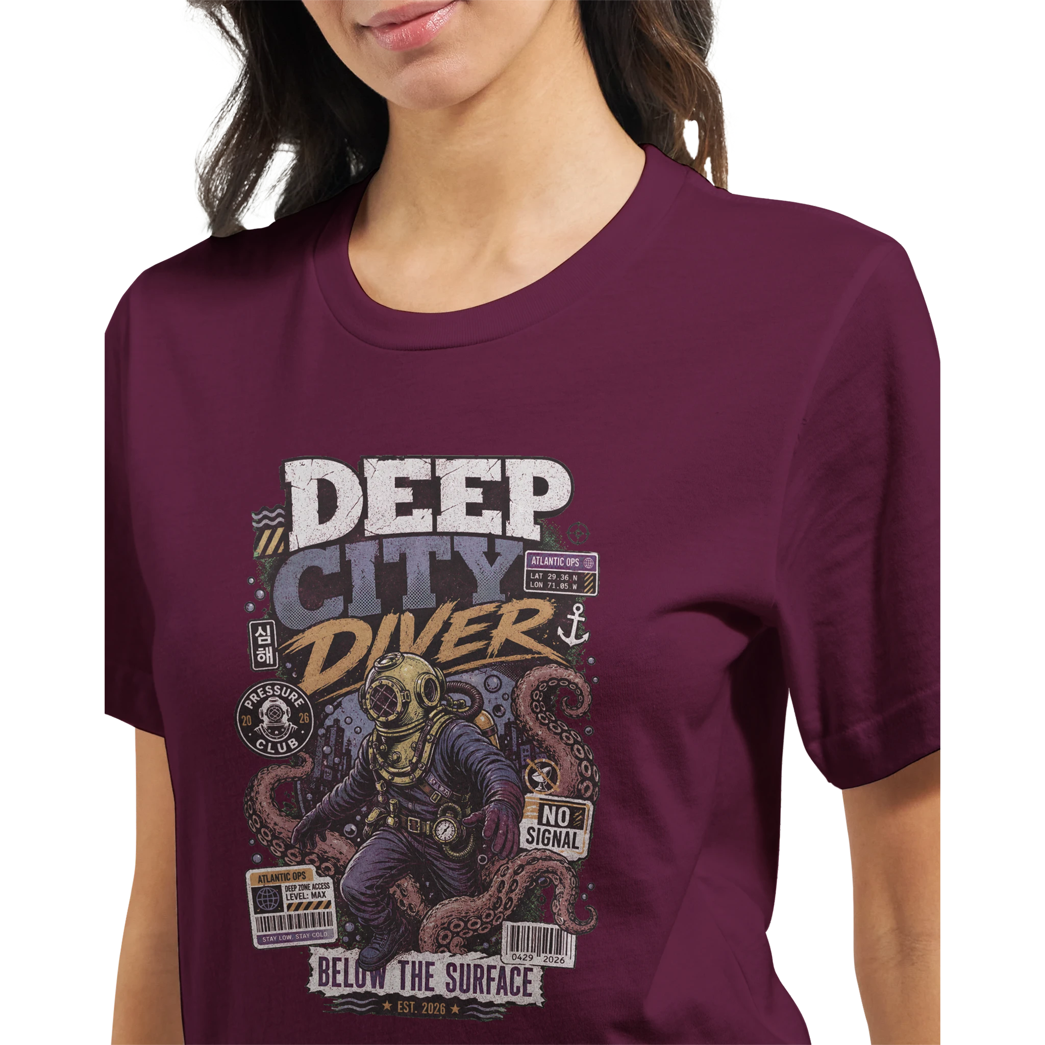 Embark on a captivating journey with the “DEEP CITY DIVER” tee, a design that plunges into the depths of retro adventure and aquatic mystery. Perfect for those drawn to the allure of the unknown and classic nautical exploration, this shirt evokes a sense of daring discovery beneath the waves.