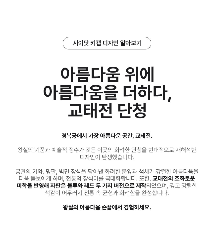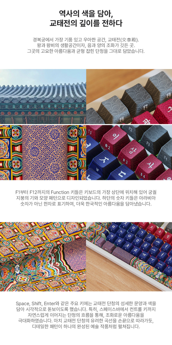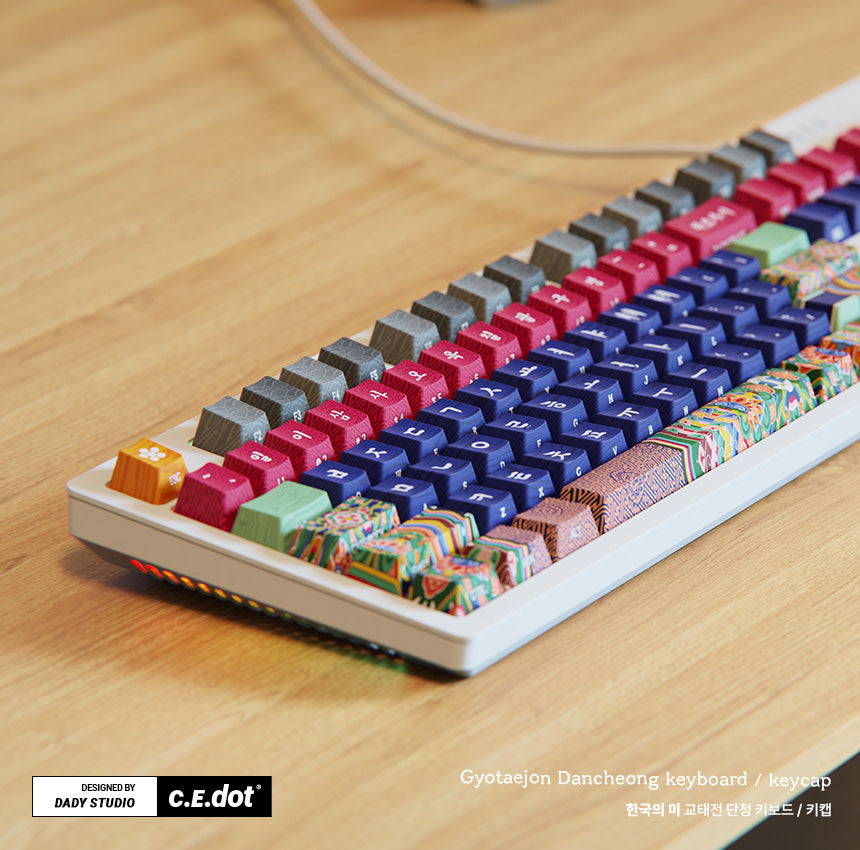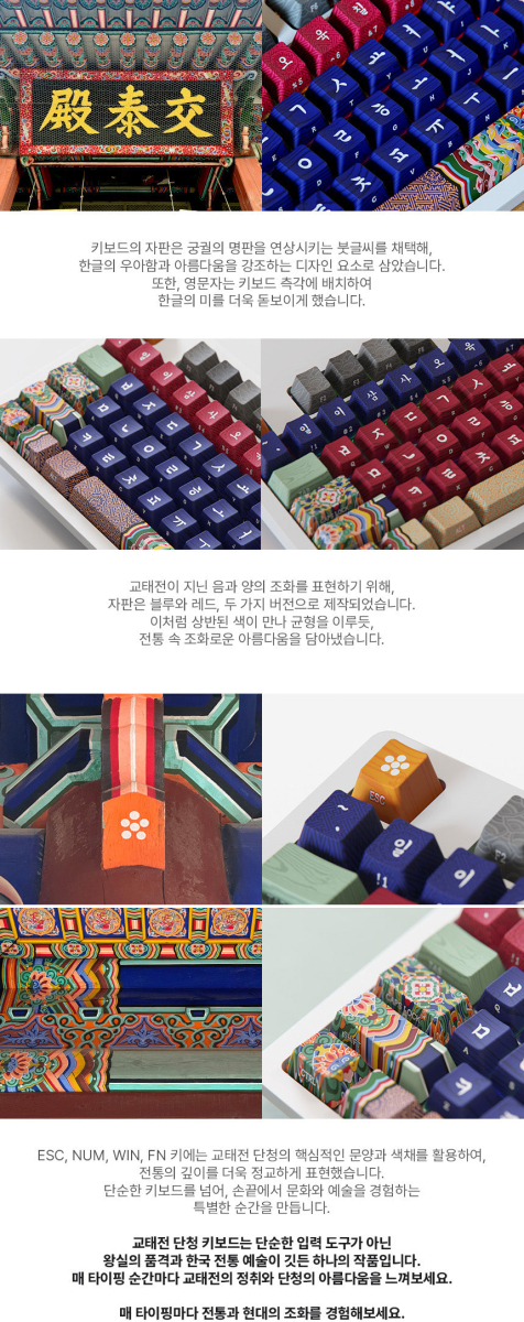 This keyboard is a modern reinterpretation of Gyotaejeon’s vibrant Dancheong (traditional Korean decorative coloring). Gyotaejeon, the royal residence of the king and queen, embodies the perfect balance of yin and yang, offering a sense of harmony and quiet beauty.