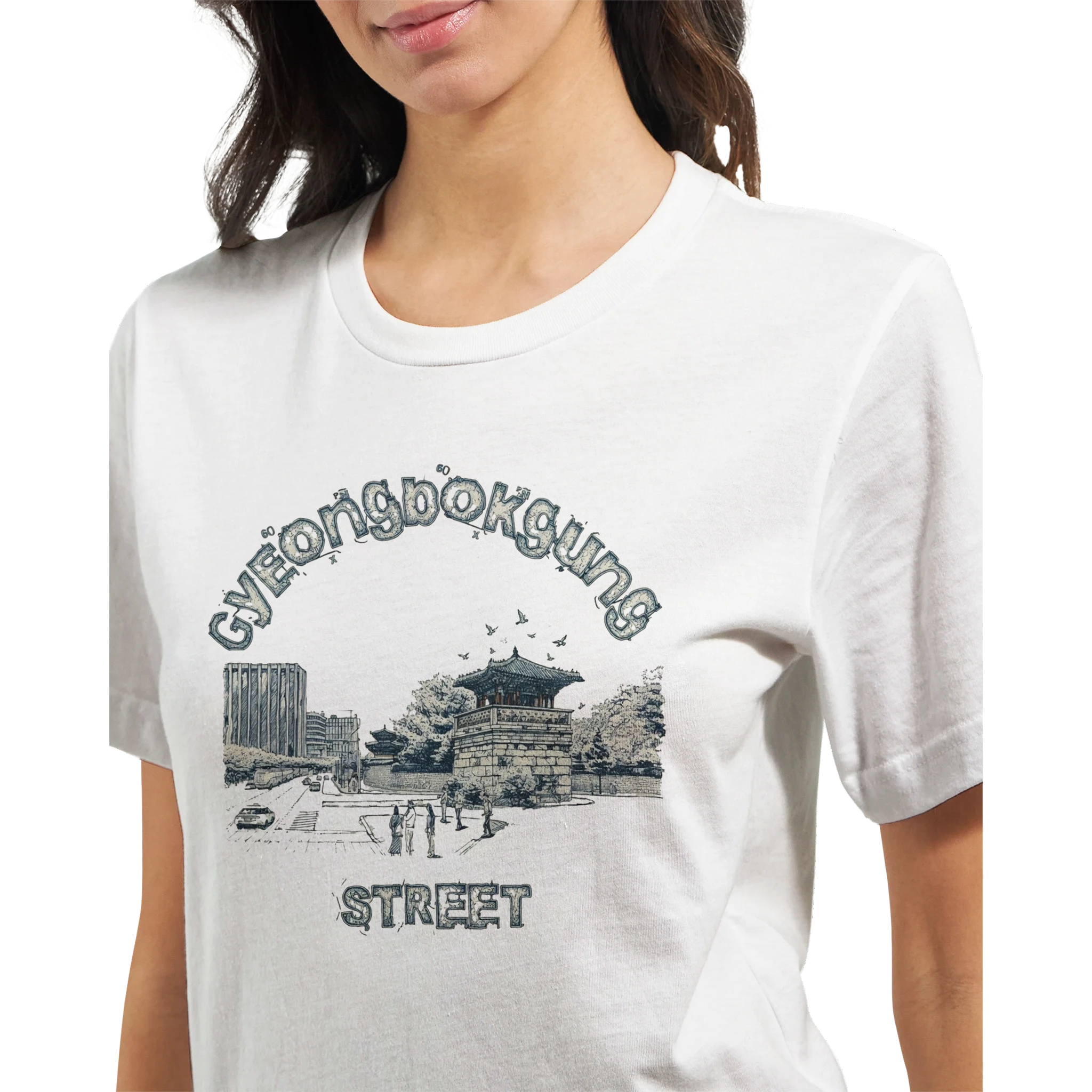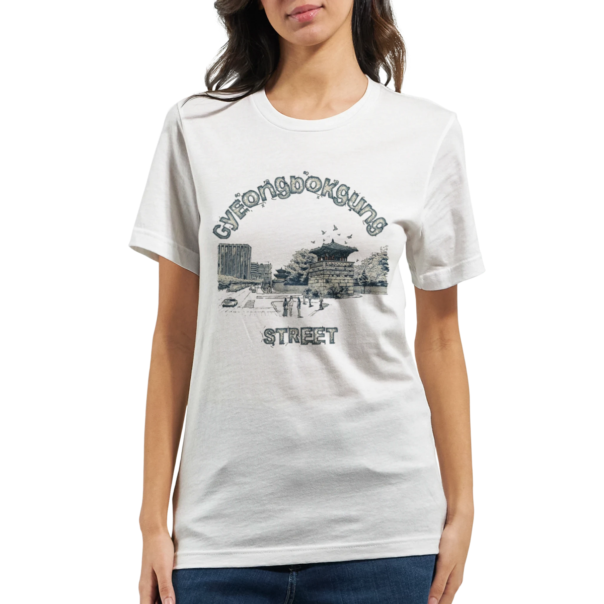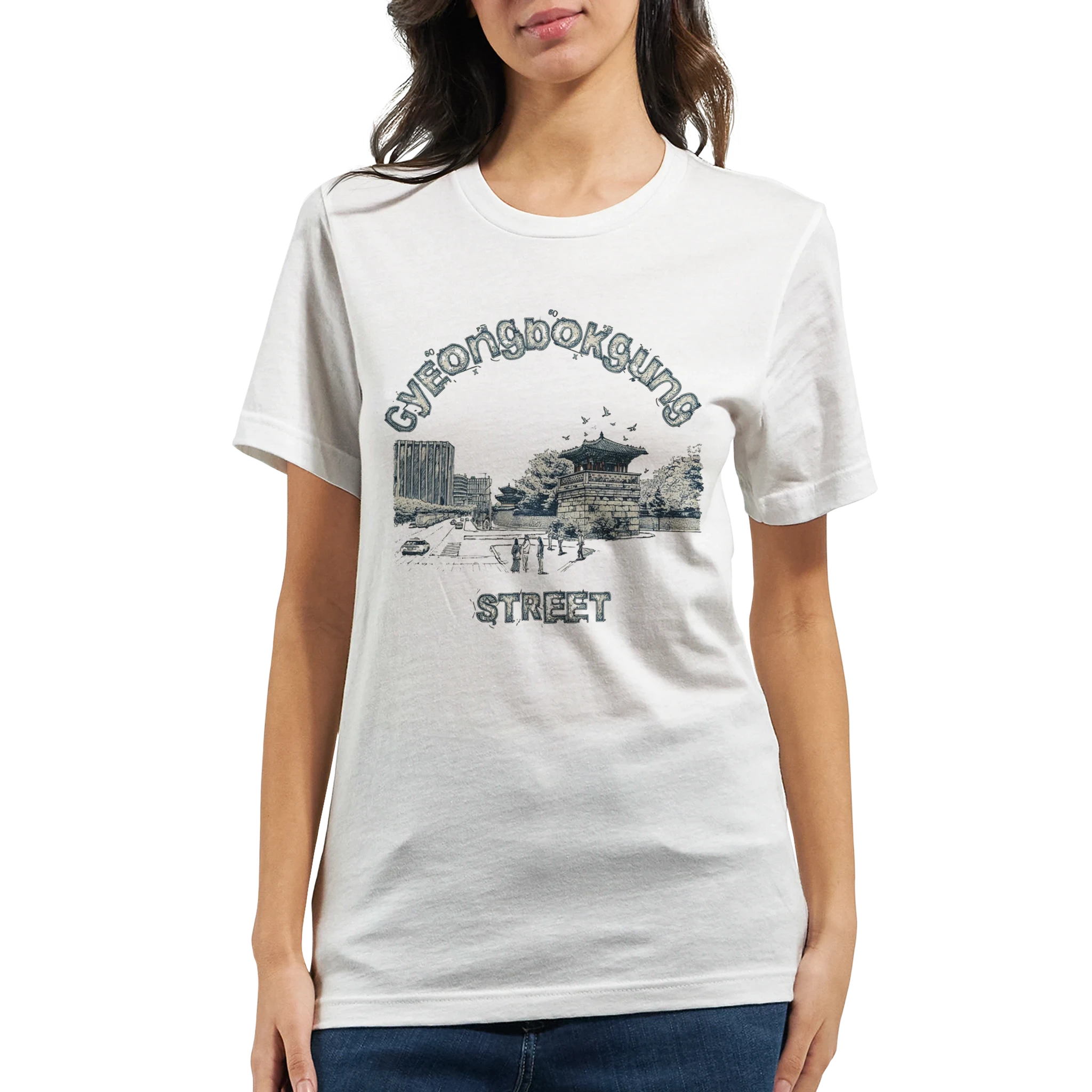 This striking illustration, rendered in a sophisticated sketch style, captures a dynamic street scene centered on a traditional Korean gate or pavilion. Modern city buildings rise in the background, creating a fascinating juxtaposition of eras. The detailed artwork includes subtle elements like cars, people, and birds, bringing the scene to life. The color palette features elegant charcoal grey for the main illustration, accented with touches of light blue and crisp white, giving the design a fresh, contemporary feel. The entire composition is gracefully framed by arched text, with the word “Gyeongbokgung” prominently displayed above “STREET”, indicating the iconic location depicted. This evocative design is expertly placed on the front center chest of the garment.