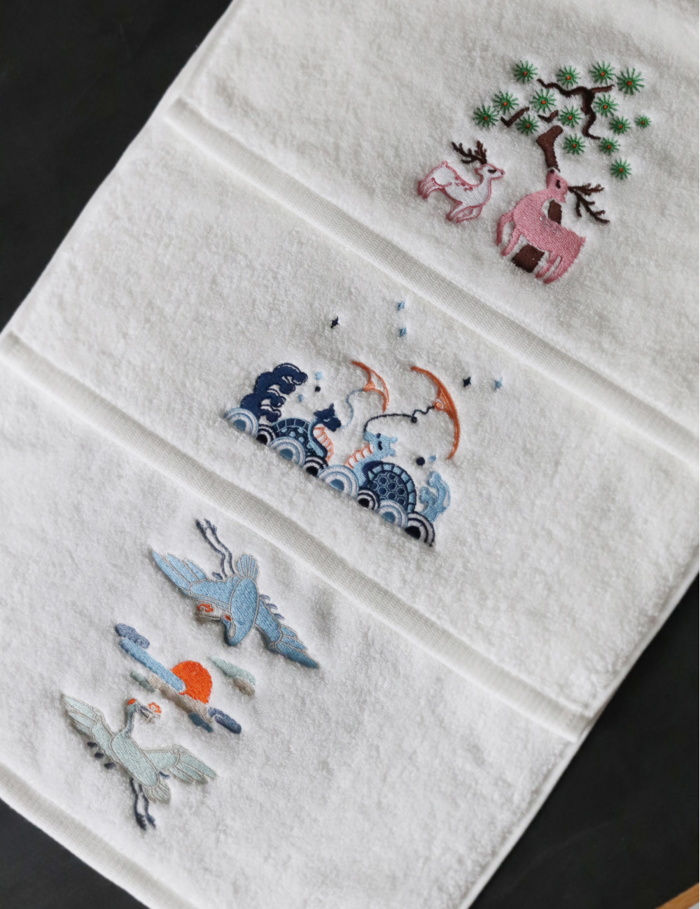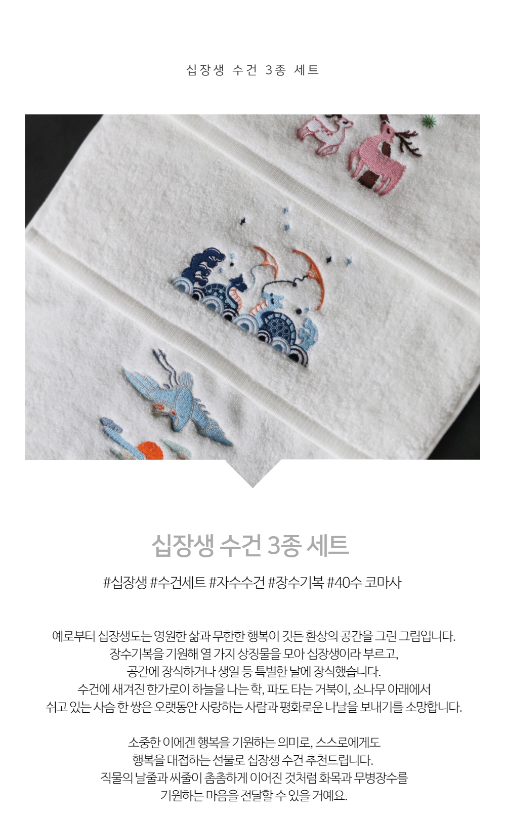 Present the gift of longevity and good fortune with this exquisite towel set featuring the beloved Sipjangsaeng motifs. Each towel showcases beautifully embroidered traditional Korean symbols of long life, making this set both practical and deeply meaningful.