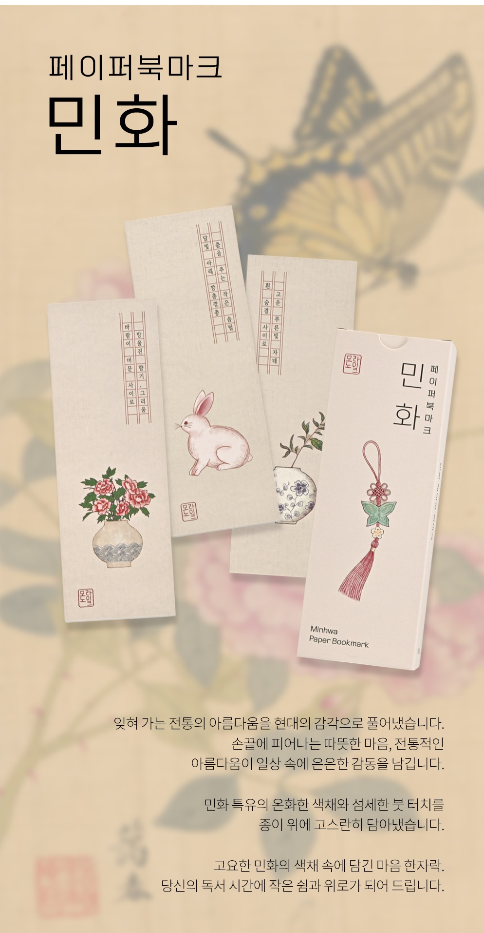 A collection of beautifully crafted bookmarks inspired by traditional Korean Minhwa art, reinterpreted with a modern touch. Perfect for marking your favorite pages while carrying a piece of timeless culture with you.