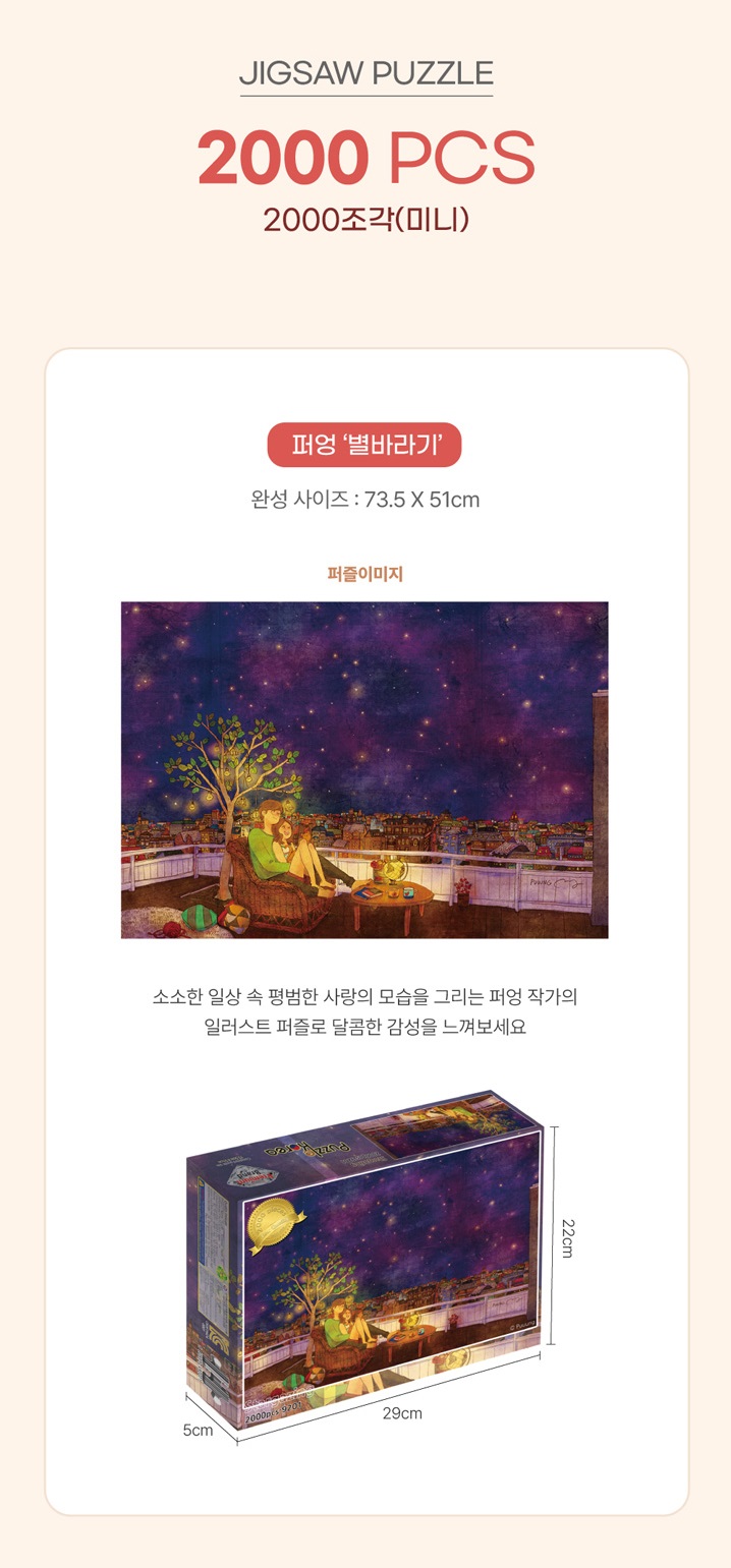 Discover the sweet charm of everyday love with Puuung’s “Starlight Gazer” in a challenging 2000-piece mini jigsaw puzzle format. Renowned Korean illustrator Puuung shares heartwarming moments from ordinary life, beautifully rendered for thoughtful puzzlers.