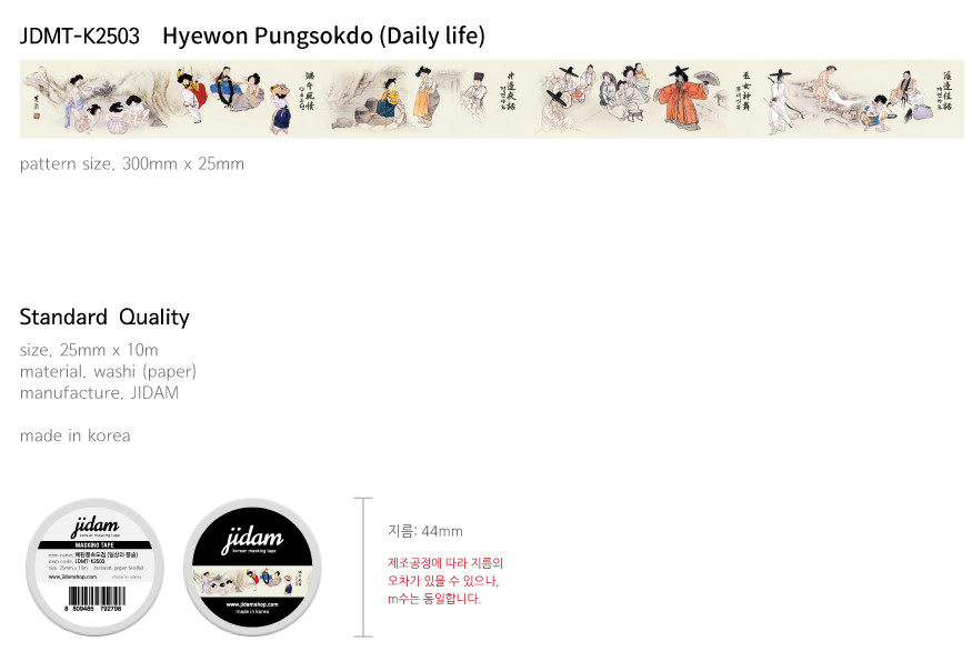Elevate your creative projects with the SINABRO THE SUP Hyewon Pungsokdo Washi Tape! This exquisite tape, measuring 25 mm x 10 m, features high-quality printing that beautifully captures the intricate details of daily life and customs, inspired by traditional artwork. Perfect for decorating journals, scrapbooks, or adding a touch of elegance to your office supplies, this washi tape not only enhances your creations but also brings a piece of art into your everyday life.