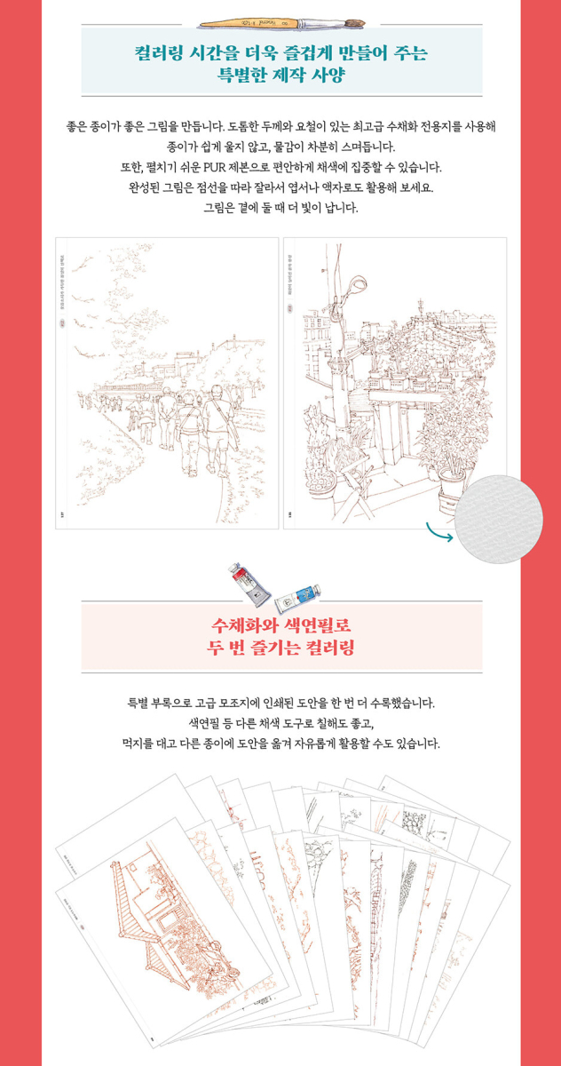 Flower pots lined up in a row, sunlit alleyways, and walls draped in falling petals—quiet scenes from a peaceful village come alive once more through the delicate hues of watercolor. As you color each simple moment, you’ll find yourself capturing the rhythm of a slower, more comforting day than city life. Let your brush paint the cherished landscapes of your heart in your own colors, one gentle stroke at a time.